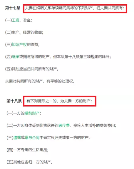 其次,如何分配保險的問(wèn)題取決于保險財產(chǎn)是兩個(gè)人的共同財產(chǎn)還是一方的個(gè)人財產(chǎn)。對于個(gè)人財產(chǎn)和共同財產(chǎn)的定義,讓我們看一下《婚姻法》第十七條、十八條、以及十九條的相關(guān)內容。